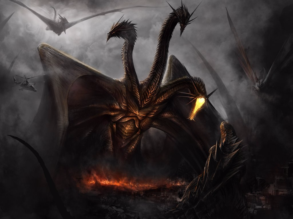 The quadruped Smaug-Ghidorah just seems like an unimaginative cop-out to me. One of King Ghidorah's most unique traits is that he doesn't walk around like a wyvern and looks like no other kind of traditional dragon. He stands upright with his wings spread out, making him tower over other monsters like Godzilla.