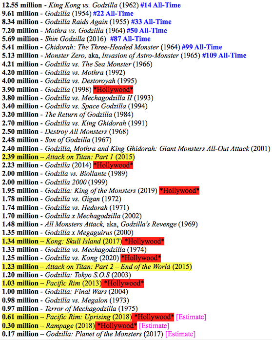Attendance including recent giant monster/kaiju films: