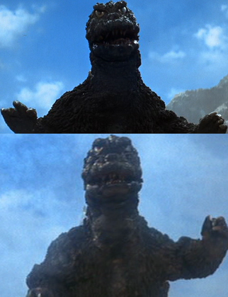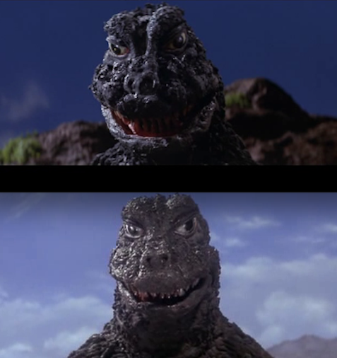 That is jarring. Reminds me of the head changes to the MusukoGoji. I've been unable to find any sources confirming whether or not an entirely different suit was built or if the head was merely adjusted during production. Still, it's pretty obvious there's a different head used in the movie depending on the scene: